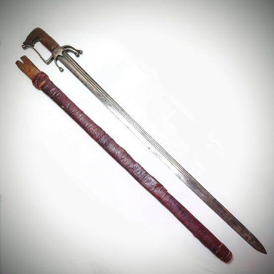 Blade of this sword is most interesting as it is a straight single edged European trade blade dating to the late 18th century on a hilt dating to the early 1800's.
