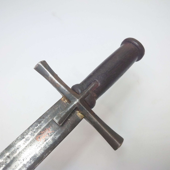A rather fun Kaskara with an earlier-than-usual German import blade dating to the early 18th century with copper inlaid armourers marks. the blade is double edged and has a wide deep single fuller.