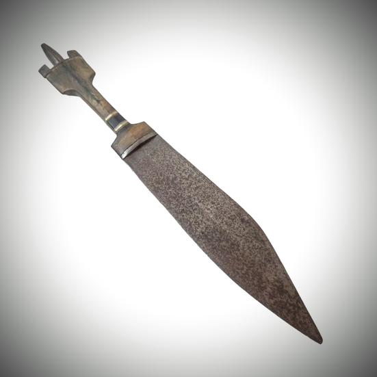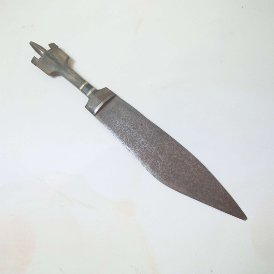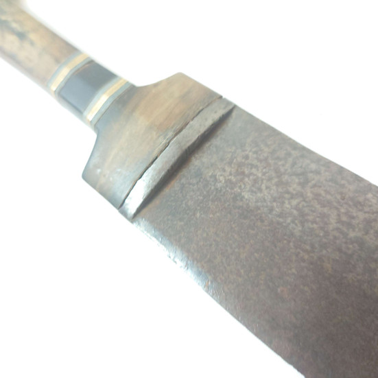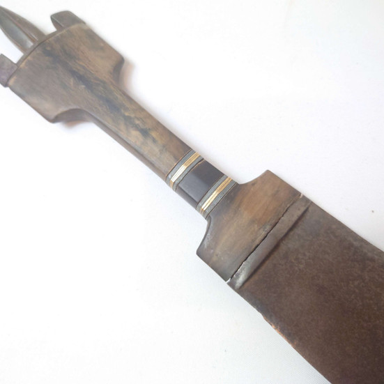 A Somali bilao dating to the last quarter of the 19th century, a type of large knife or short sword often paired with a buckler sized shield called a gashaan. These pieces have a long cutting edge and a two step bac edge with a large "clip" point similar to a bowie.