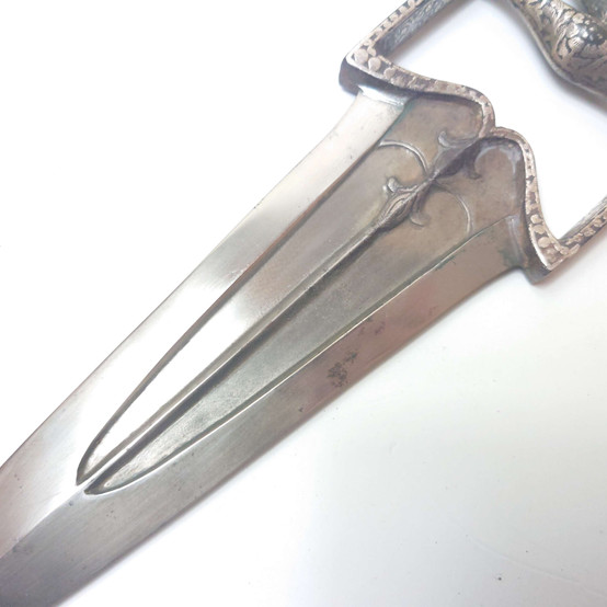 A rather nice wootz katar with a highly decorated silver koftgari hilt. The blade is thick with an armour piercing tip and well defined fullers.